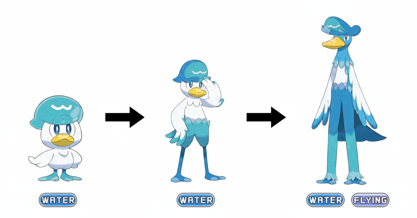 Quaxly Evolution Line (Water → Water → Water/Fighting)