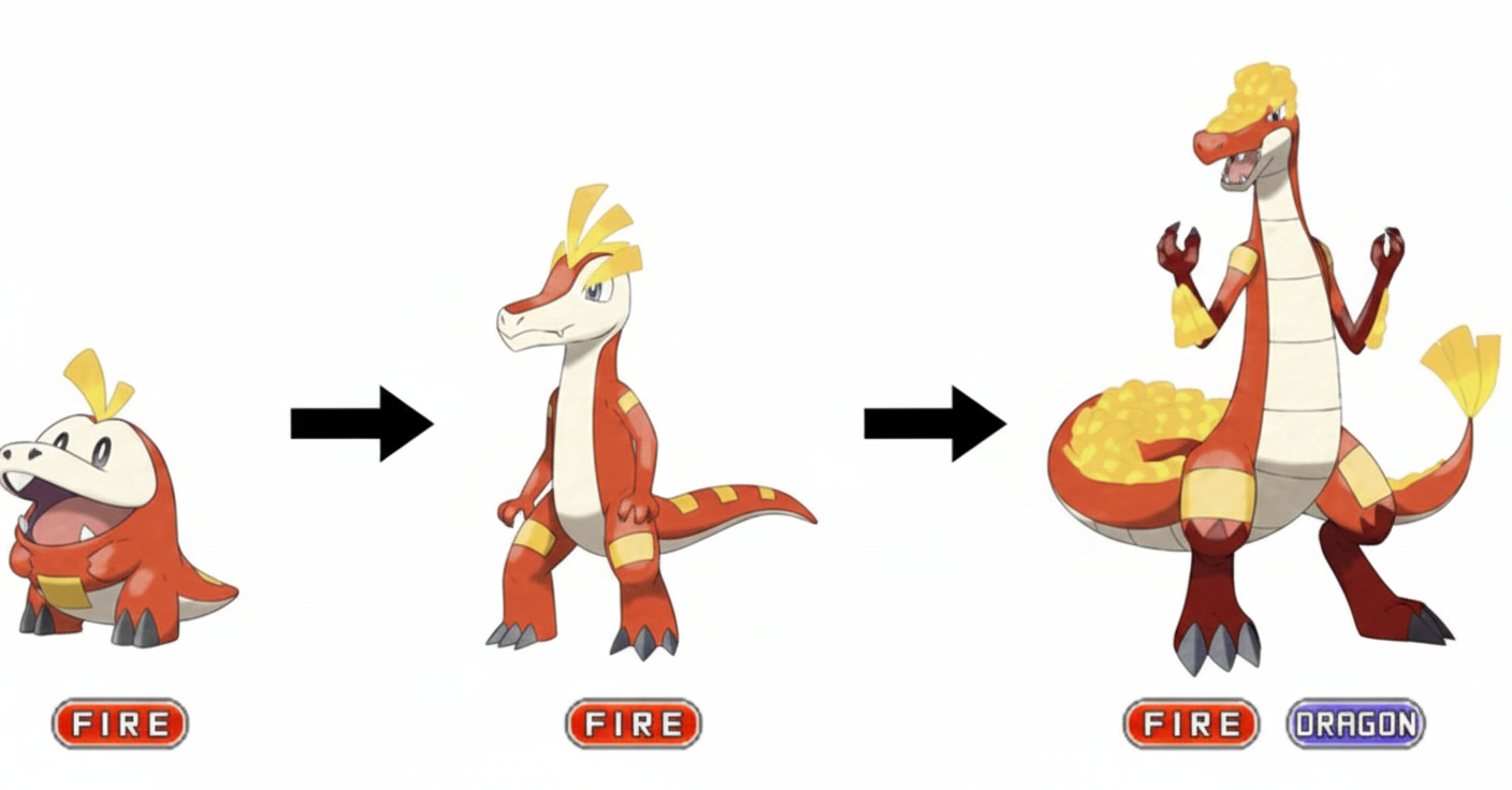 Fuecoco Evolution Line (Fire → Fire → Fire/Ghost)