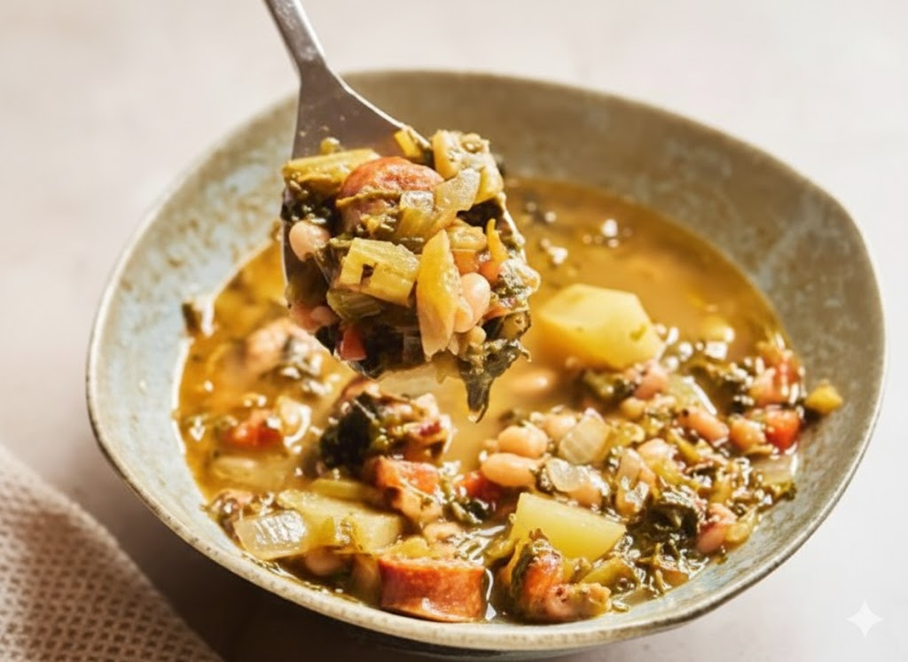 Greens and beans were common. Meat was added if available. Slowly this soup became common in homes.
