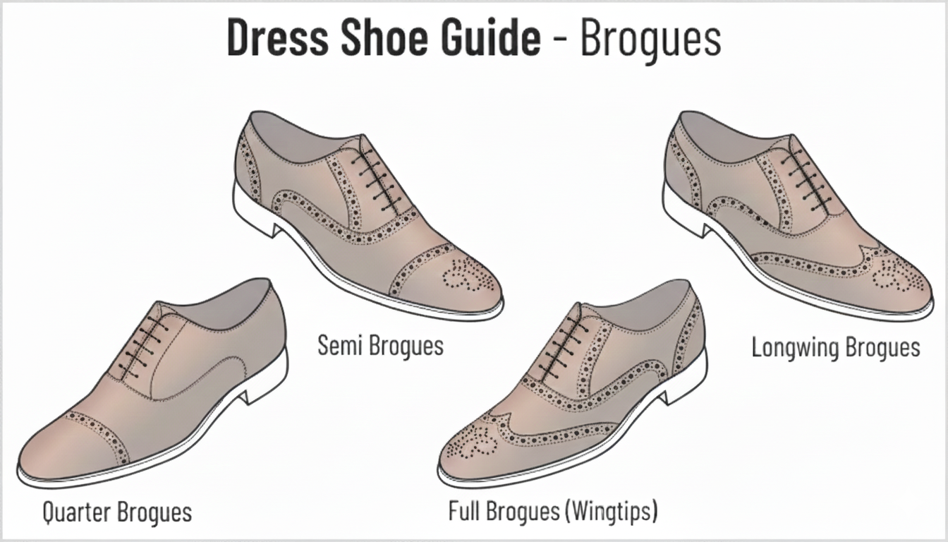 Understanding the different types of wingtip shoes can help you choose the right pair for your wardrobe. Here are the main variations: